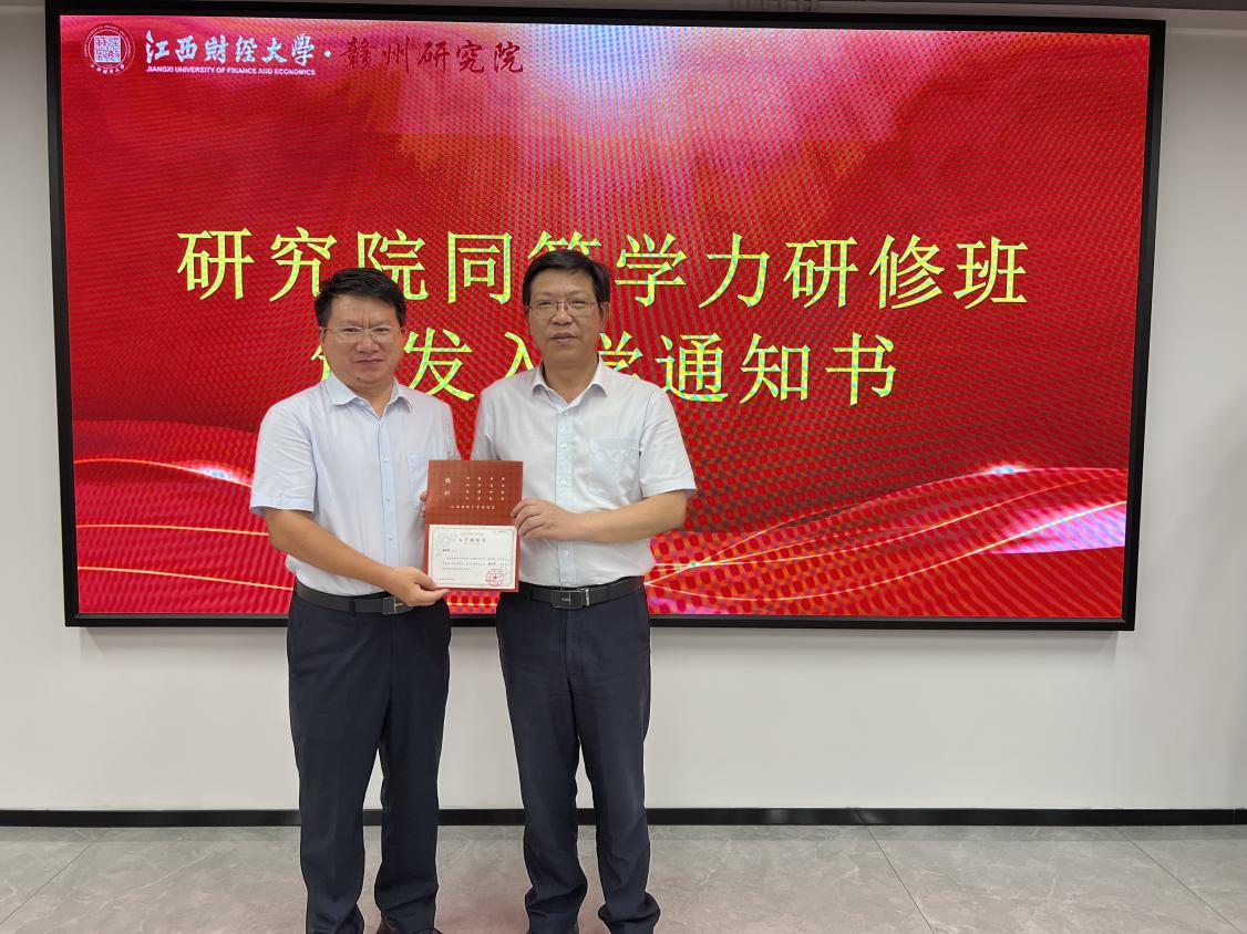 现场资格审查和图像指纹采集采集工作结束后,举行了同等学力申硕研修班入学通知书颁发仪式,赣州研究院院长邹勇文发表了重要讲话。江西财经大学党委常委、副校长袁红林教授、赣州研究院院长邹勇文以及相关学院院长为三十多名学员颁发入学通知书。